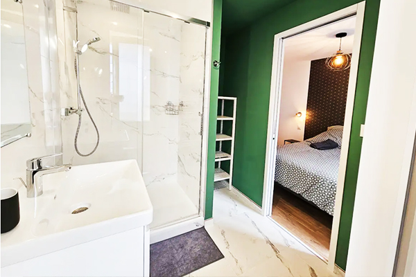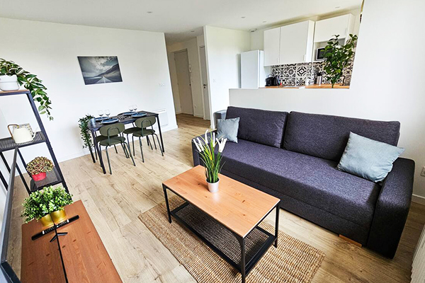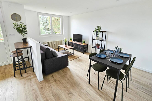 La salle de bains et la chambre, rénovées avec soin, ont été pensées pour apporter confort et praticité au résident, tandis que la nouvelle organisation du salon et de la cuisine favorise la convivialité et la luminosité.
